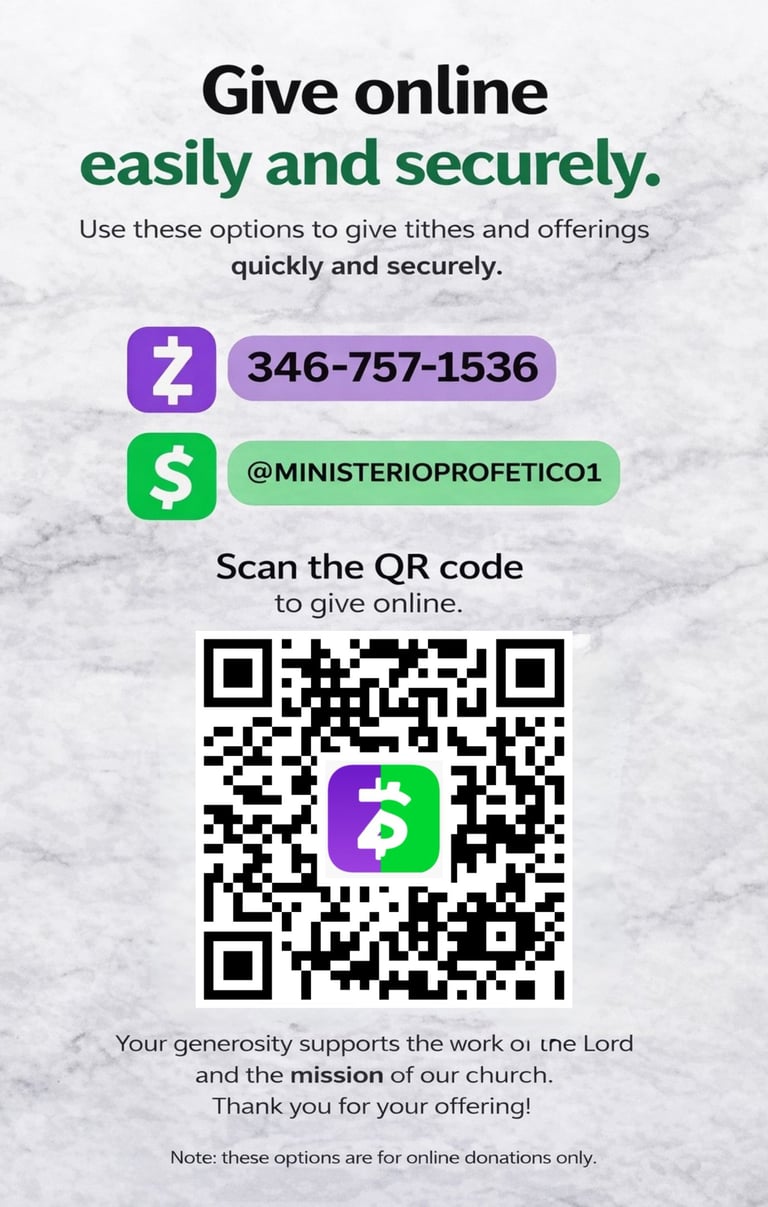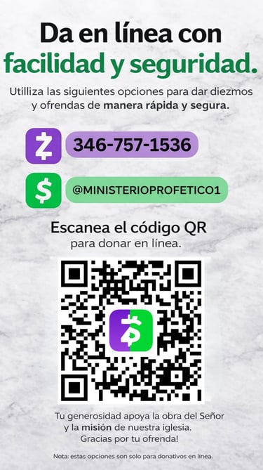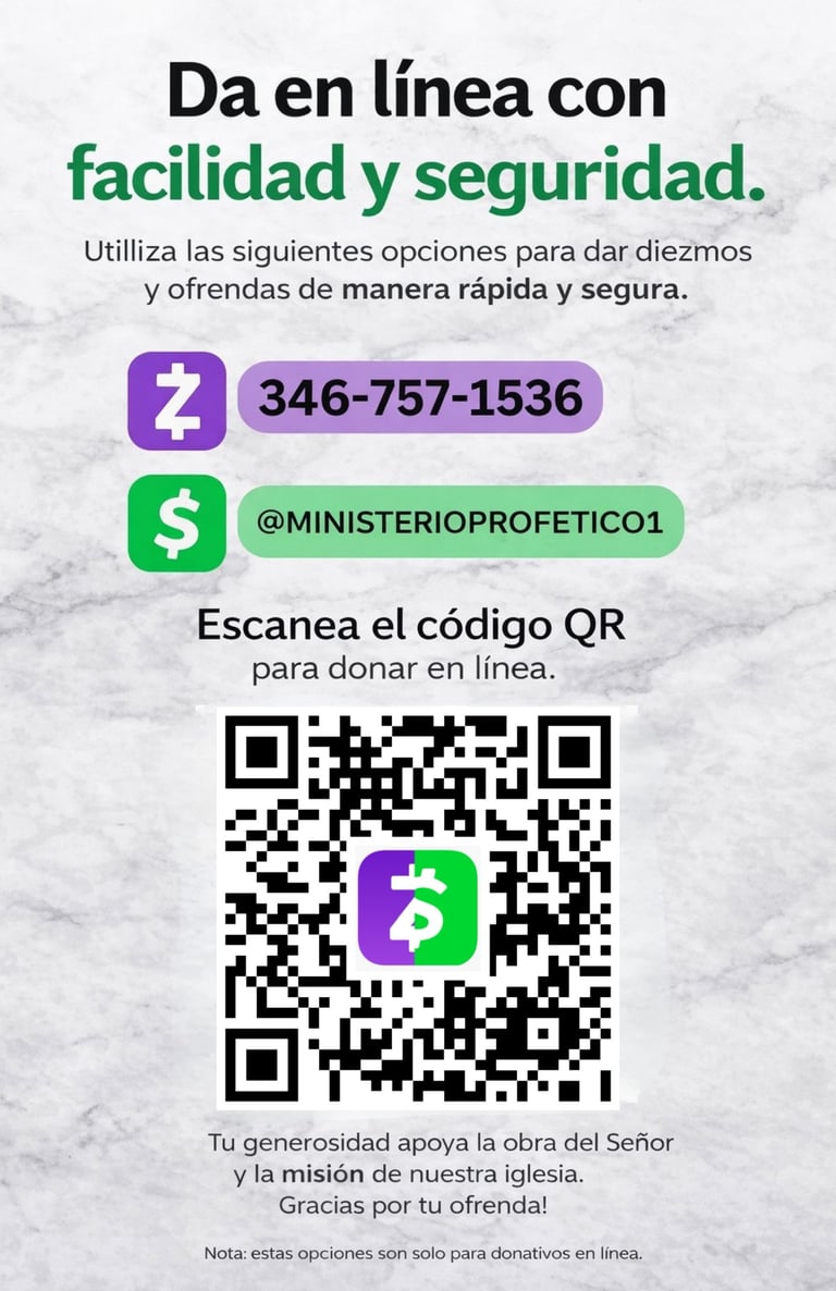 Creemos que dar es una expresión de amor, gratitud y obediencia al Señor. Cada ofrenda es una oportunidad para honrar a Dios y apoyar la obra que Él está haciendo en esta casa. Tu generosidad nos ayuda a seguir predicando a Cristo, discipulando vidas, sirviendo a las familias y extendiendo el evangelio.“Dios ama al dador alegre.”